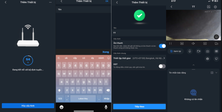 - Chờ quá trình kết nối cho đến khi màn hình hiện lên như hình bên dướ "Thêm thiết bị thành công" thông báo quá trình kết nối thành công. Lúc này bạn có thể tùy chỉnh tên, ngày giờ hiển thị, cảnh được sử dụng theo ý của mình và bấm “Xong”